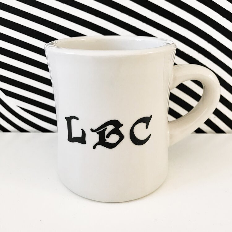 Vintage style Little Coyote Coffee Mug with our Pizza Stab Logo on the front and “LBC” on the back